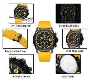 این ساعت با بندهای سیلیکونی در رنگهای مختلف مانند زرد،سبز، آبی، قرمز، نارنجی و مشکی عرضه میشود. این امکان شما را قادر میسازد تا با توجه به سلیقه و استایل خود، بند مناسب را انتخاب کنید و ساعت را با لباسهای مختلف ست کنید.