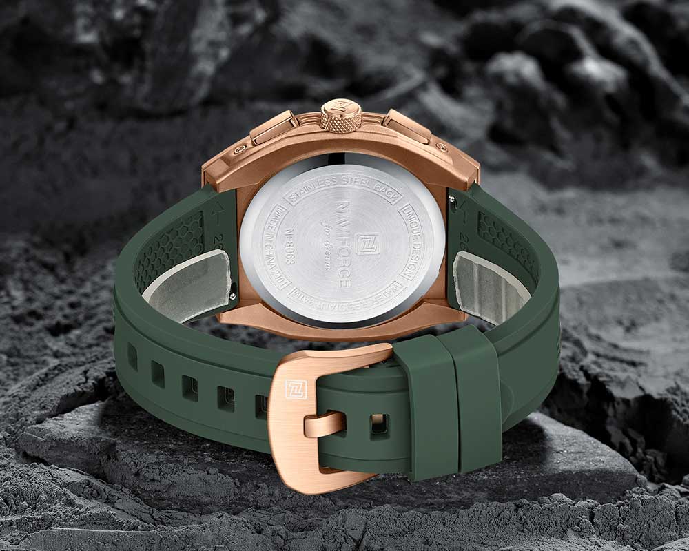قلب تپنده ساعت مچی مردانه نیوی فورس NAVIFORCE NF8063 یک موتور کوارتز کرنوگراف قدرتمند است که زمان را با دقت عالی اندازه‌گیری می‌کند. کرنوگراف این ساعت برای افرادی که به فعالیت‌های ورزشی یا زمان‌بندی دقیق علاقه دارند، یک مزیت بزرگ محسوب می‌شود.