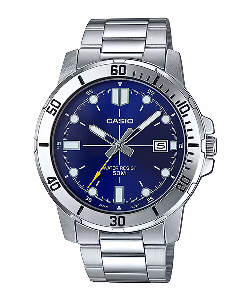 یکی از ویژگی‌های خاص ساعت مچی مردانه کاسیو CASIO MTP-VD01D-2EVUDF طراحی تمیز و شیک آن است. صفحه‌ آبی عمیق (Navy Blue Dial) در کنار قاب استیل نقره‌ای، جلوه‌ای چشم‌نواز و رسمی ایجاد کرده که با استایل‌های مختلف — از تیپ روزمره تا لباس رسمی — هماهنگ می‌شود.